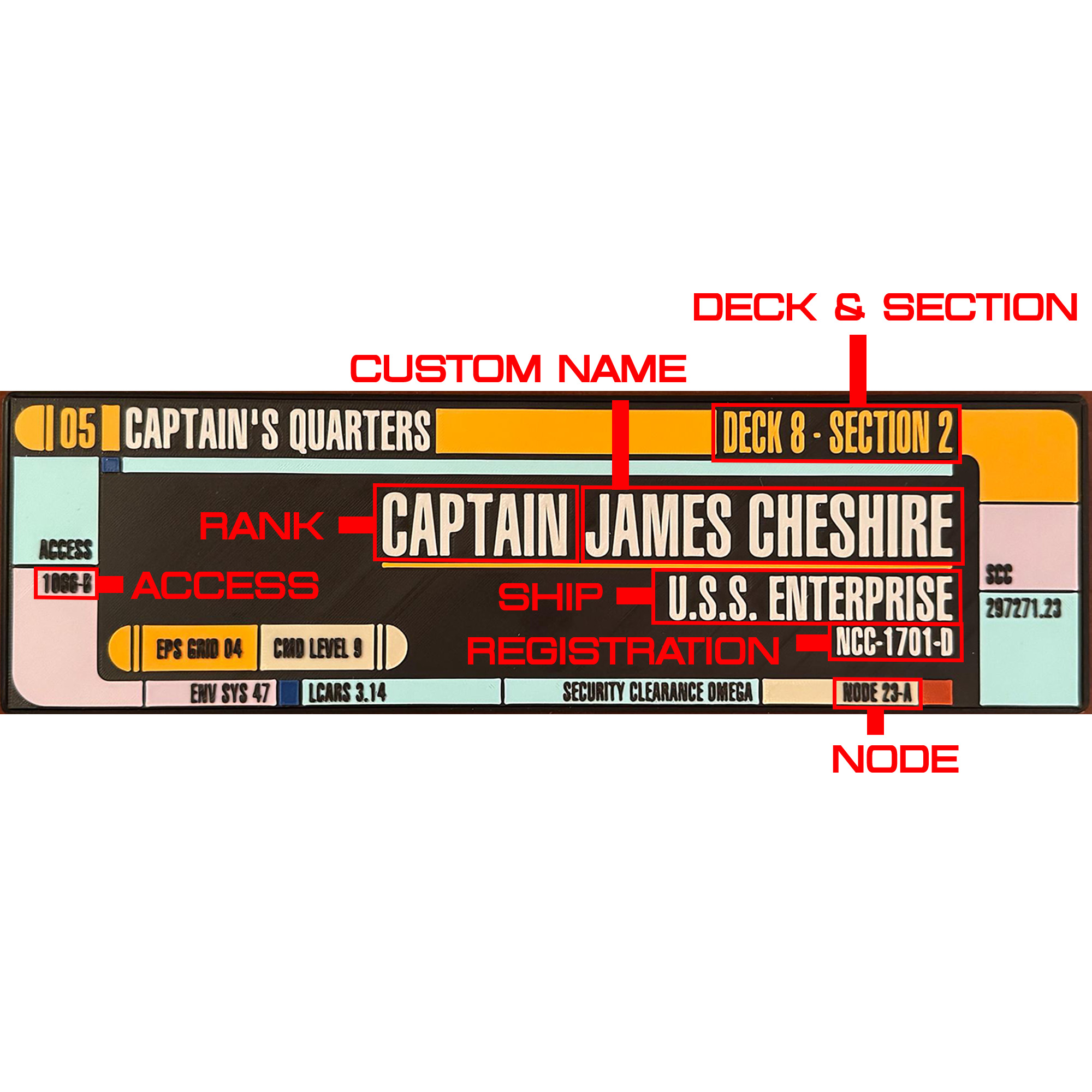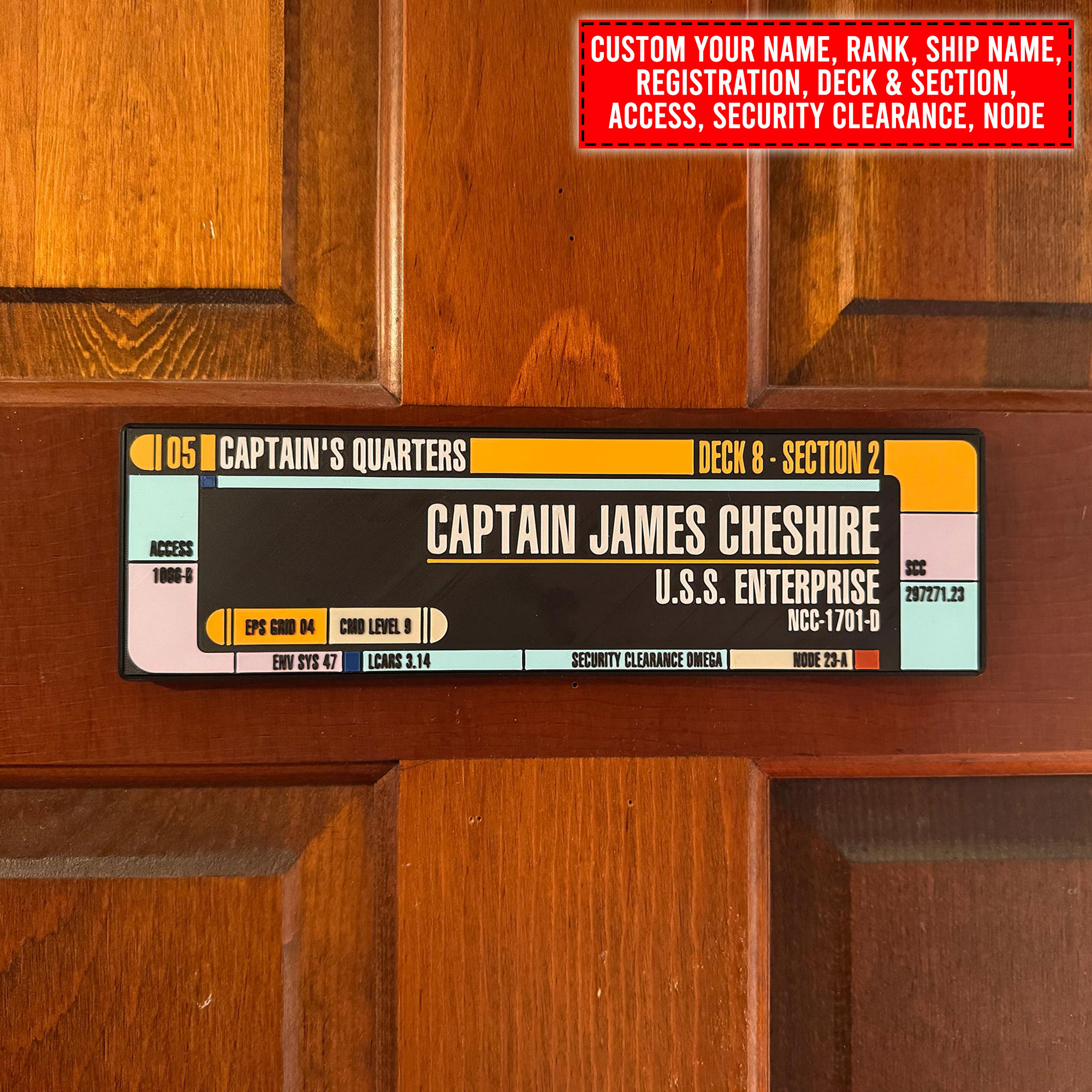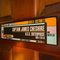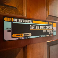 Transform your space into a Starfleet haven with our Star Trek LCARS personalized nameplate or door sign. Crafted with precision and love for all Trekkers, this sign allows you to add your name and rank, making it a unique piece for your collection or a perfect gift for a fellow Star Trek enthusiast.