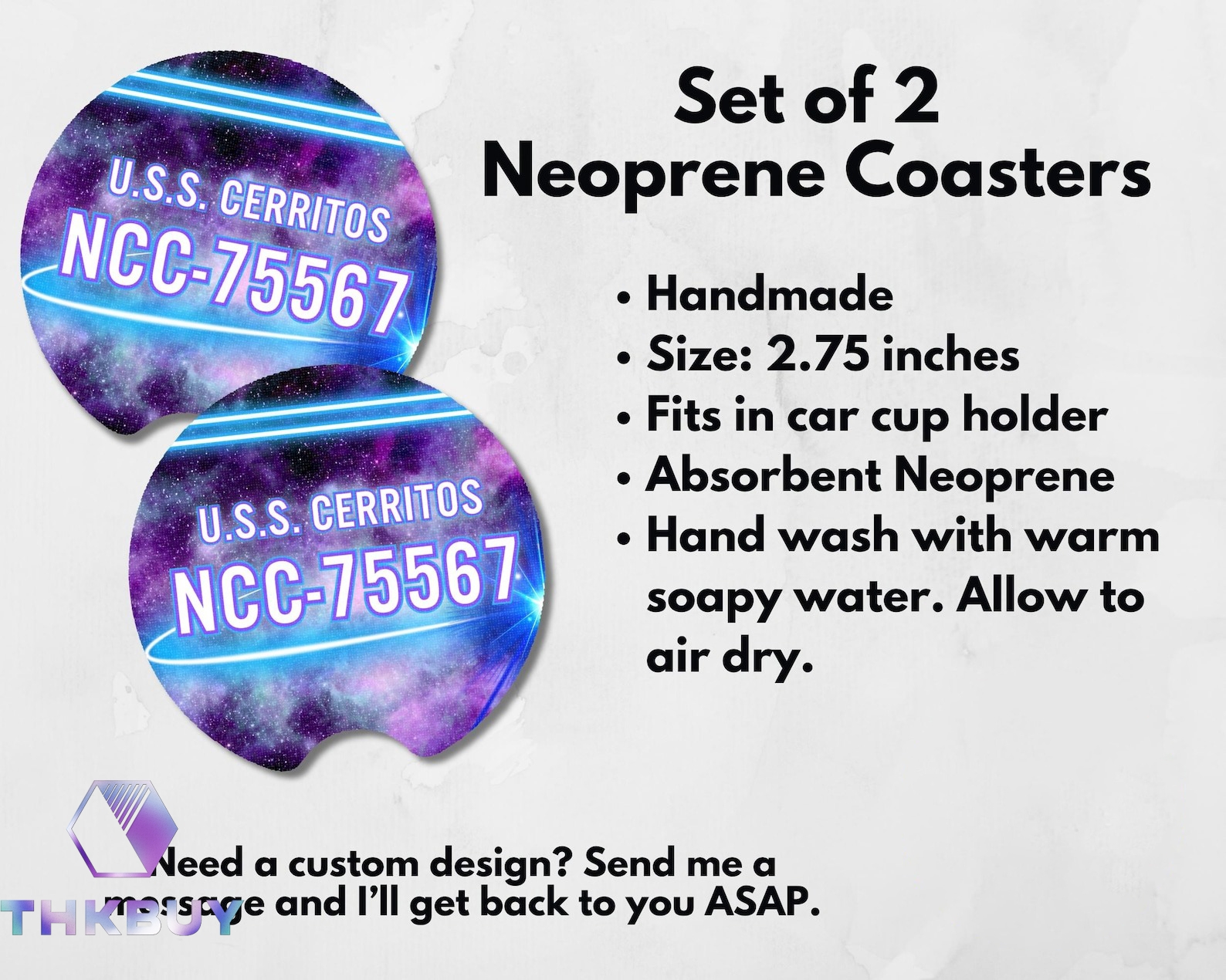 Keep your cup holders dry in Starfleet style with these customizable absorbent coasters! Add Ship name, Registry, a favorite designation for a personal touch. Whether commuting or exploring the galaxy, bring the final frontier to your ride, Live long, drive safe, and prosper! 🖖